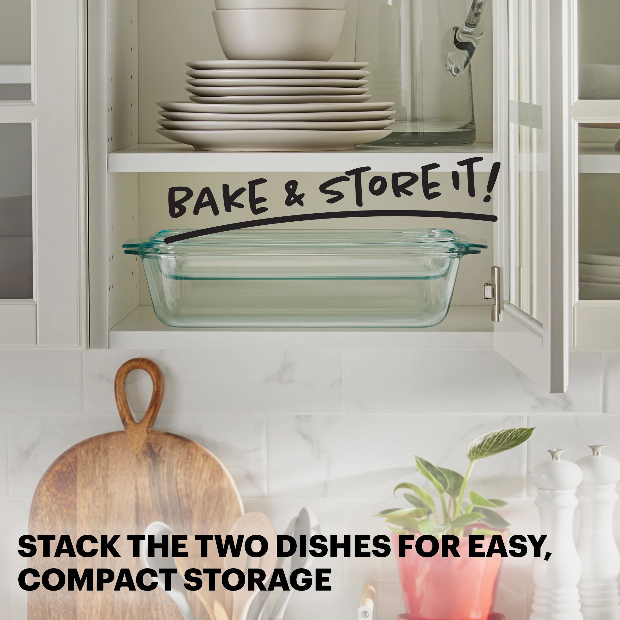 Deep glass baking dish includes a glass lid that doubles as a shallow baking dish.